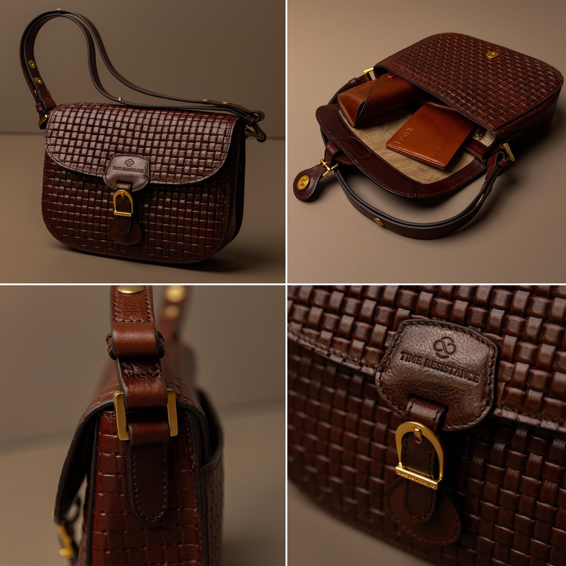 Time Resistance leather shoulder bag, magnetic closure, brown saddle handbag